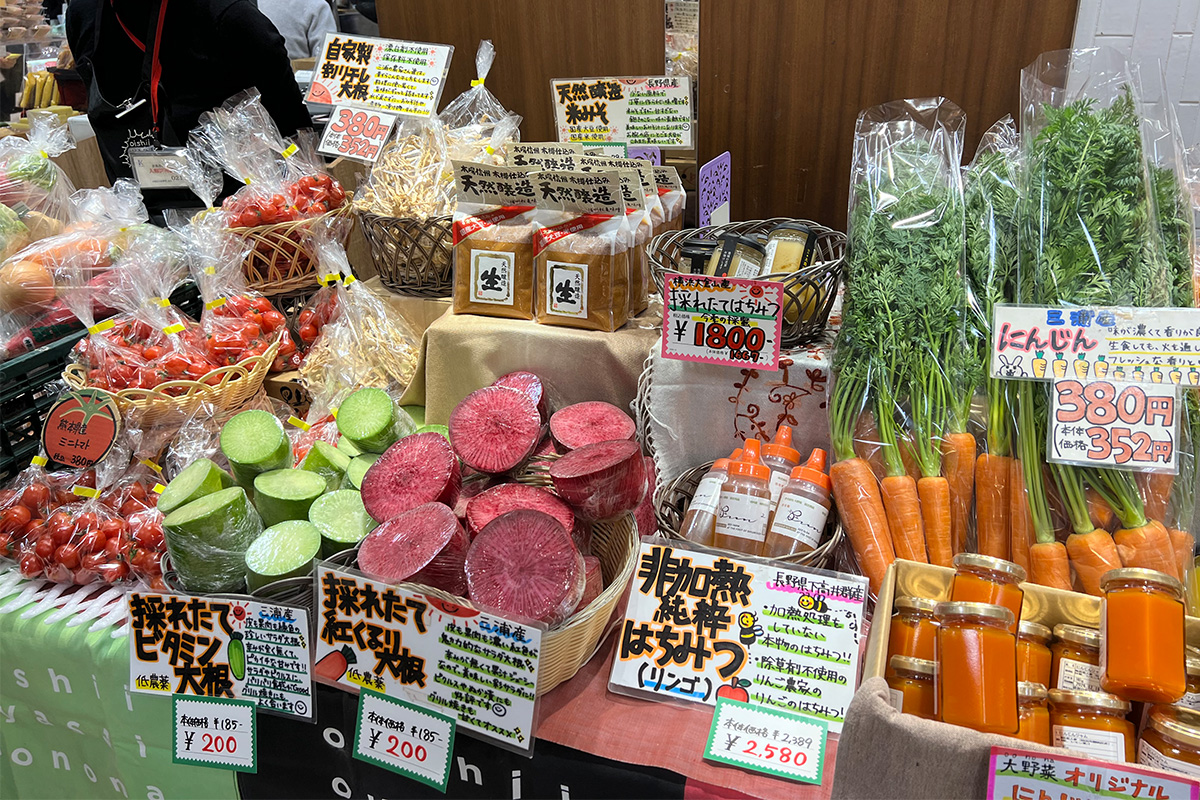 それ以外にもミニトマト、葉付き人参、紅くるり大根などのお野菜に、超低農薬高原りんご、採れたて伊予柑などのフルーツもご用意しております。
