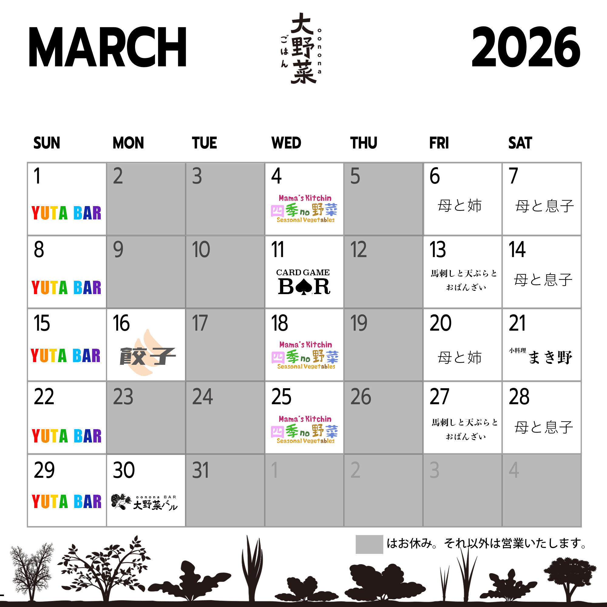 2026年3月のごはん店のスケジュールのご案内です。