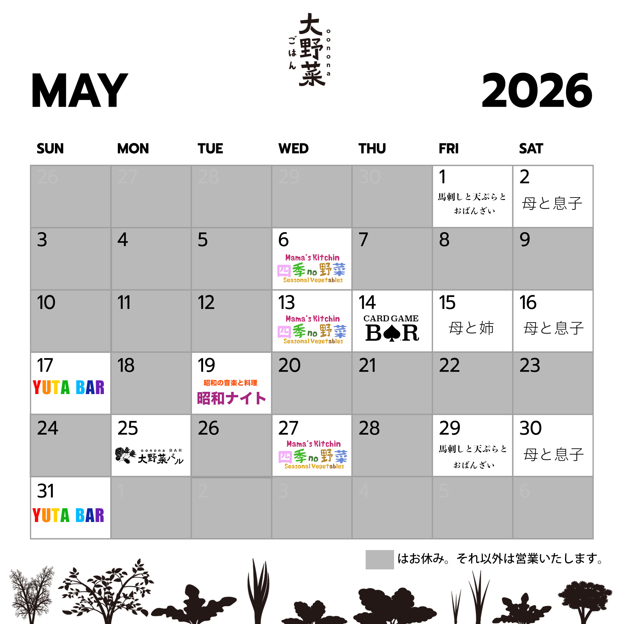 2026年5月のごはん店のスケジュールのご案内です。