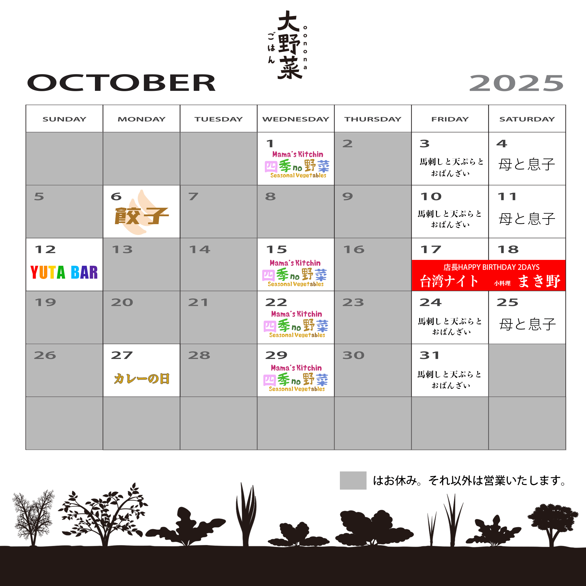 ↑大野菜ごはん店店長の誕生祭を開催!今年は台湾ナイトとまき野の2日間!お楽しみに!!