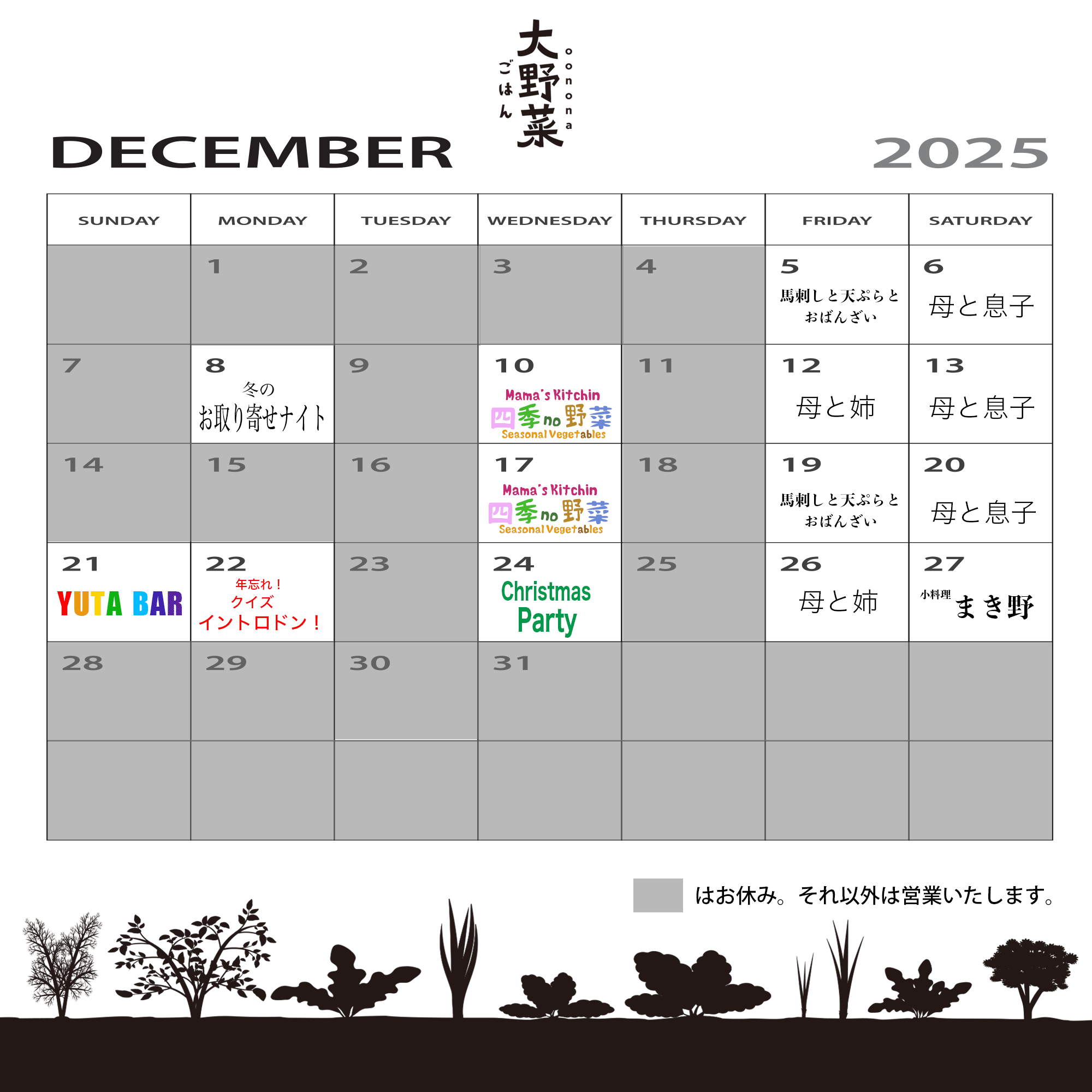 12月のごはん店のスケジュールのご案内です。