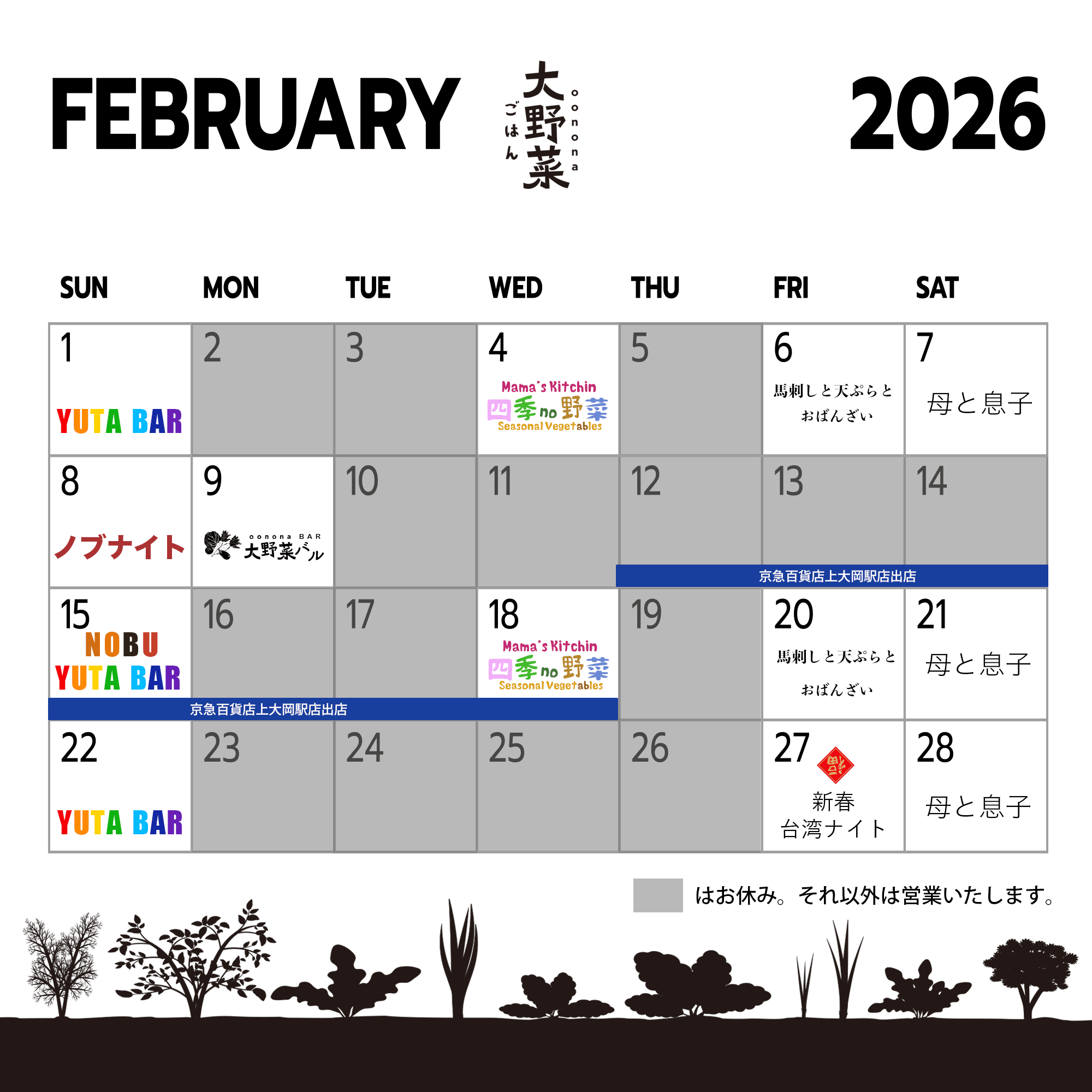 2026年2月のごはん店のスケジュールのご案内です。