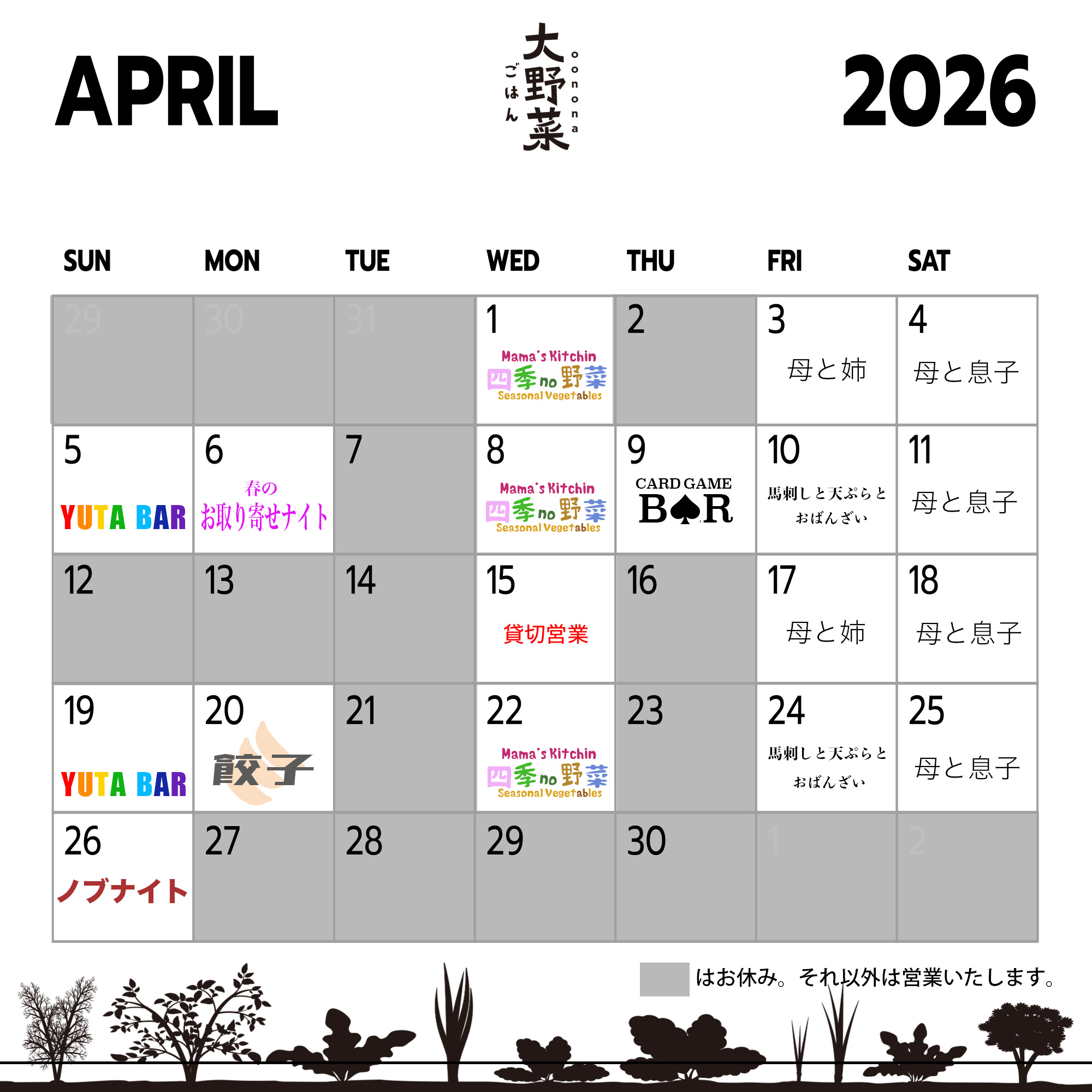 2026年4月のごはん店のスケジュールのご案内です。